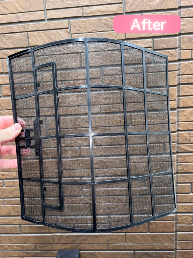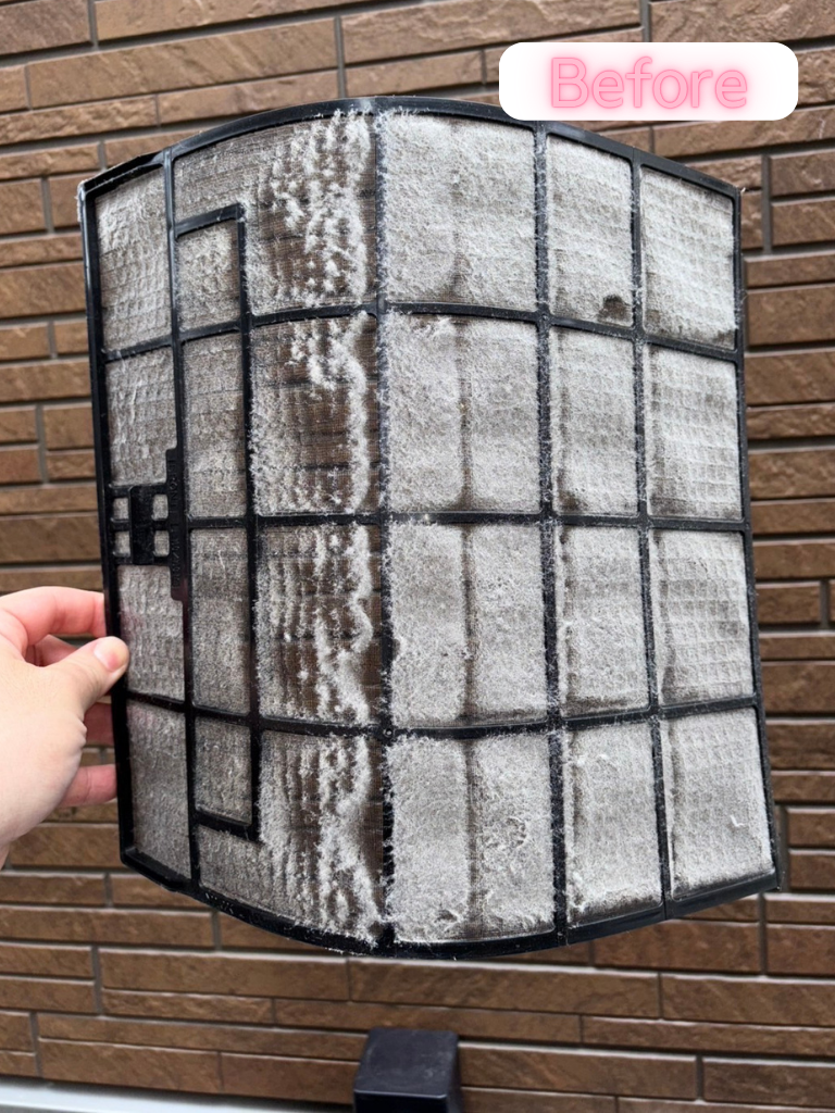 長年使用されたエアコンのフィルターは【ホコリやカビがびっしり】詰まっている状態でした。